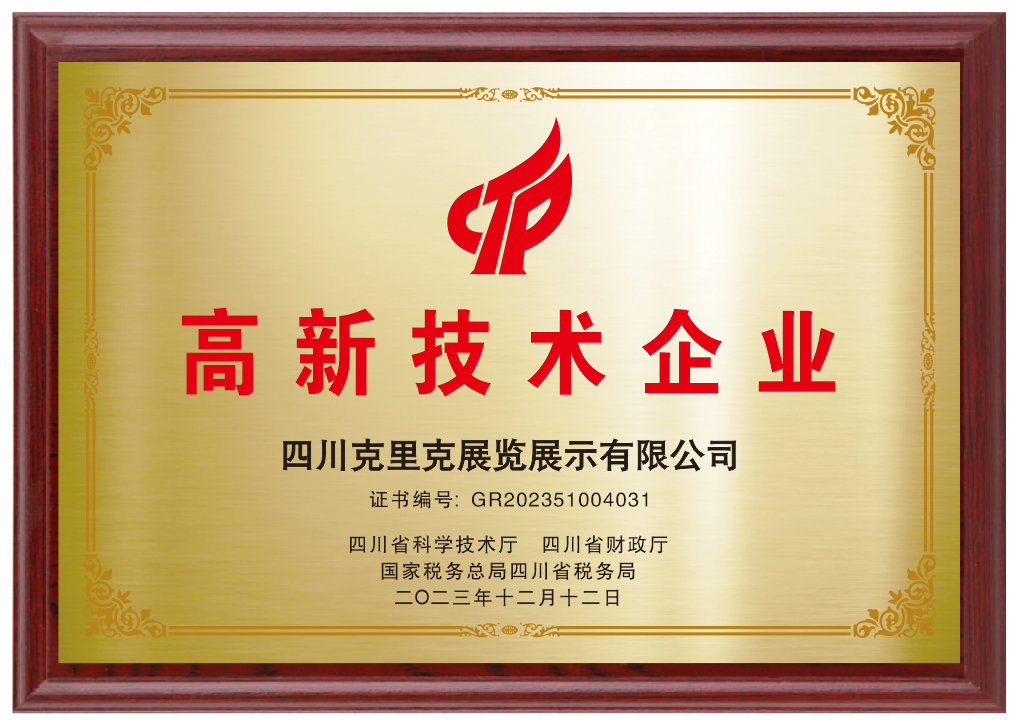 荣获高新技术企业认定;研发:实用新型专利4项(文物展柜收纳装置;平面作品展示装置;侧开圆形展柜;圆柱侧滑展柜)